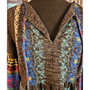 This dress offers a vibrant, bohemian style with its unique floral patterns and multicolor design. It's suitable for casual gatherings and cozy days.