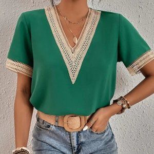 Bohemian V-neck Lace Solid Minimalist Blouse green