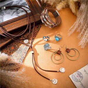 - A rustic bohemian jewelry set featuring a layered choker necklace, leather wrap bracelet, double-hoop earrings, and three turquoise-accented rings.
