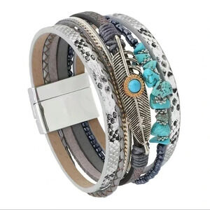 Bohemian Western Turquoise Faux Leather Layered Wrap Magnetic Bracelet