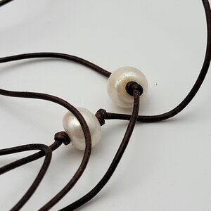 Bohemian White Baroque Pearl Brown Leather Cord Tassel Toggle Necklace 38"