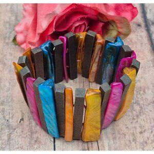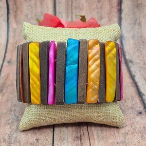 Bohemian Wood Bar & Dyed Abalone Shell Colorful Wide Stretch Bracelet Beach