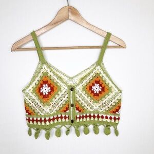 Bohemian crochet, multicolored button, front top with a Y2K vibe