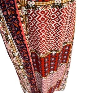 Forever 21 crocheted top backless boho maxi dress. V neckline & sleeveless. Below the crocheted part of dress is lined. Hand wash. Shell 100% Acrylic Lining 100% Rayon P2P 12.5 length 39 lining length 14.5 Embrace a bohemian vibe with this stunning patchwork maxi dress. Featuring a mix of red and cream hues, this dress is perfect for any casual outing. Enjoy the comfort and style it brings to your wardrobe SFPF HOME