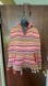 There are no fabric tags, but I believe this to be an acrylic in a bright, cherry burgundy, brown pink and orange primarily fair aisle. There’s a little green and yellow in here as well. There are no size tags, but because of the shoulder size and the width of the garment I’m going to list as a small little pockets for your hands to fit through ending in tassel. Fun in excellent condition.