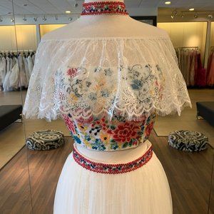 Bohemian inspired two-piece with a lace over the shoulder ruffle and matching choker