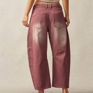 These jeans are a soft, lightweight denim with a beautiful barrel shape that looks just as pictured on the model.
