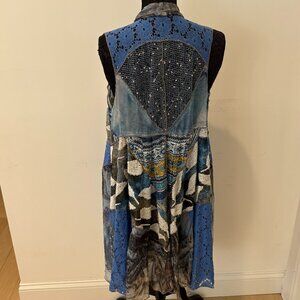 What a find! This duster-length, one-size-fits-all patchwork vest with visible overlock seams, in shades of blue, yellow, gold and white, will add a Bohemian flair to any outfit, from jeans and a turtleneck to a slinky evening dress. Beautiful openwork lacy fabric alternates with a print of white leaves on a blue background, medallions in shades of blue and gold, and ribbon-like geometric prints.