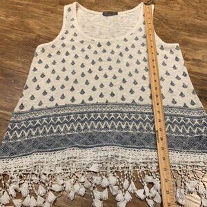 Fun Bohemian white and blue sleeveless top from Suzy Shier. Love the dangling details at the bottom. Minor mark on arm cuff. Gently used condition.