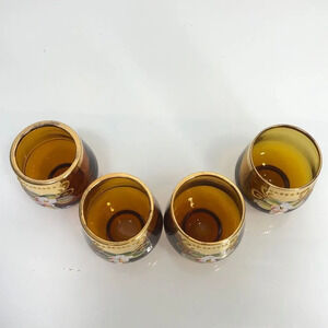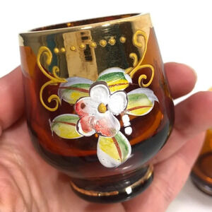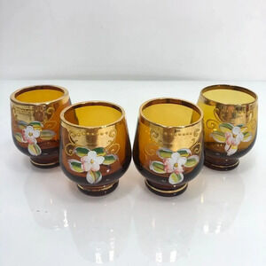Bohemian Amber Glass Gold Gilding Raised Hand Painted Floral Design Shot Glasses