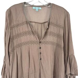 Bohemian Bell Sleeve Blouse V Neck Taupe Flare Button Relaxed Size M She + Sky