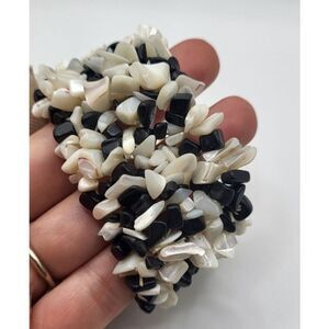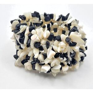 Bohemian Chunky Bold Abalone Shell Onyx Bracelet 7in | Materials: shell, onyx | Length: 7in | Clasp: stretchy | Signed? no | Excellent vintage condition