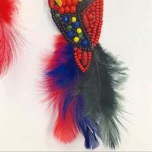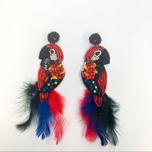 Bohemian Parrot Beaded Feather Drop Earrings - These earrings are so super fun and vibrant! Primary colors, red, yellow and blue pop against the black and white contrast. A few green beads are added for accent. The red, blue and black feathers make a bold statement. There are also some sequins and a jewel for extra flair.