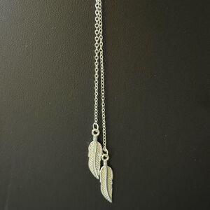 Bohemian silver tone Y shaped necklace with lobster claw clasp. Features pendant with 2 leaves.