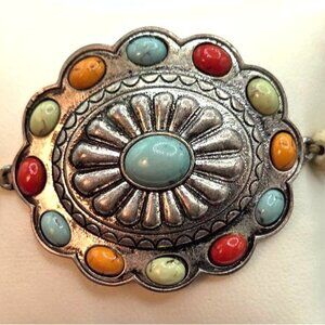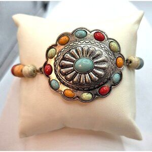Bohemian-Style Turquoise & Multi-Color Bracelet With Silver Tone Centerpiece