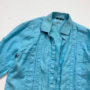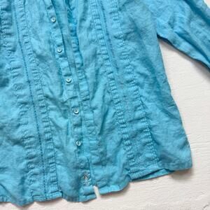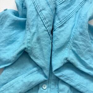 Bohio Blue Linen Button Up Pleated Embroidered Shirt, Size Medium