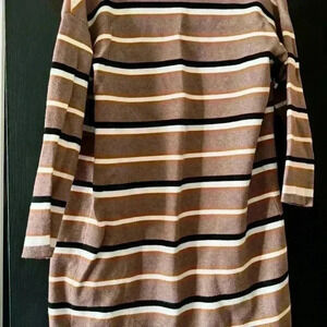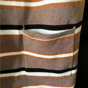 Stylish brown cardigan with black, white, and tan stripes. Open front design. Perfect for layering.