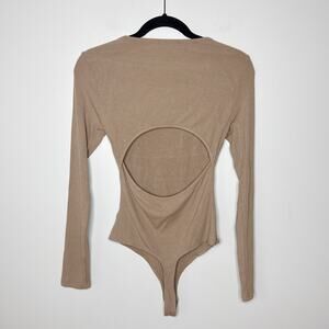 Bohme Noelle Ribbed Open Back Beige Bodysuit Medium Long Sleeve Chic Classic