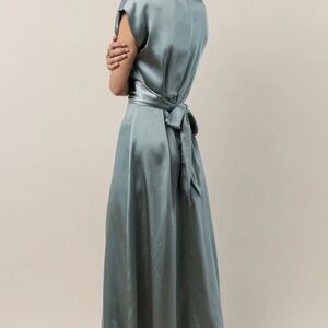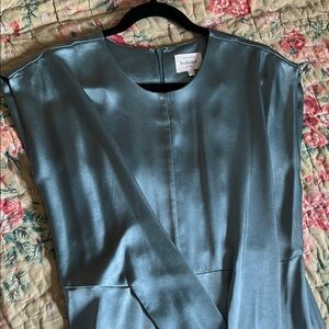 Elegant blue satin dress with a sleek design. Perfect for formal occasions. EUC