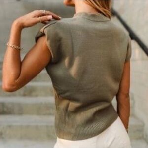 Chic olive green sleeveless sweater. Perfect for layering or wearing alone. Soft and comfortable fabric.