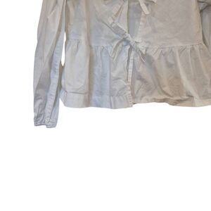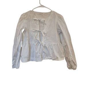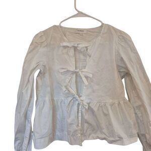 Elegant white blouse with tie details. Features long puff sleeves. Perfect for casual or dressy occasions.