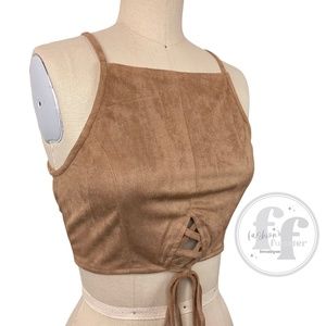 Boho chic vintage inspired 1960’s - 1970’s style crop top in a beautiful buttery soft tan faux suede. Slender straps, sexy zip-up back, decorative front lace detailing with self-tie.
