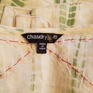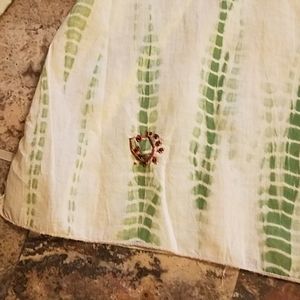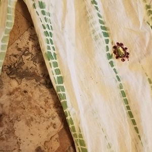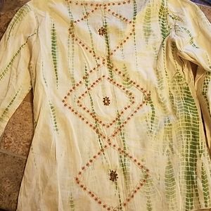 Very cute boho tunic. Cotton. Very light weight. On the right sleeve their are a few dots. See photo. On the front on the bottom right missing a gem