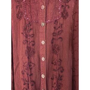 Boho 90s Brick Red Embroidered Button Front Grungy Festival Midi Dress, Medium