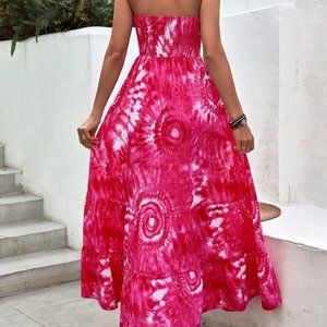 Boho Allover Print Shirred Detail Ruffle Hem Tube Dress
