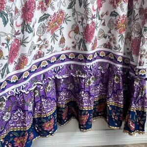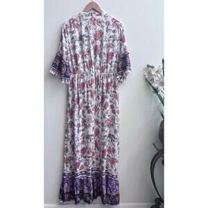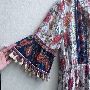 Boho Anany Floral Print Pompom Tassel Trim Maxi Dress Bell Sleeve Women's Sz XL