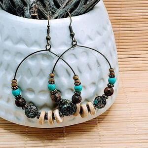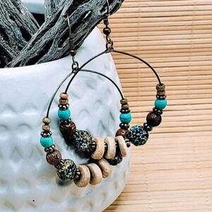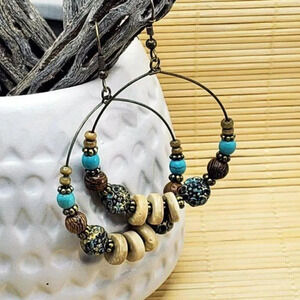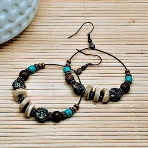 Boho Antiqued Patina Wood Beads Hoop Earrings