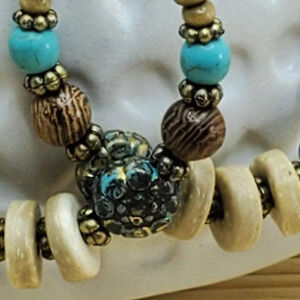 Natural wood and coconut shell beads, along with verdigris patina antique look acrylic beads and accents