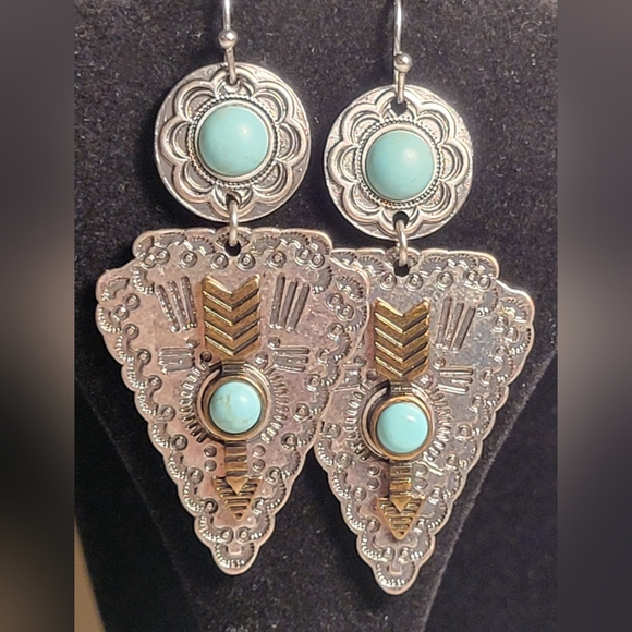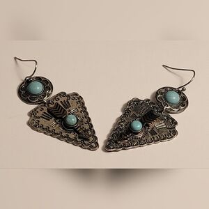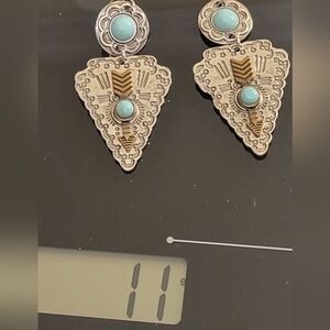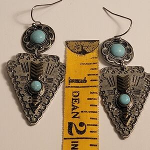 These exquisite silver tone earrings feature a stunning turquoise accent, perfect for adding a touch of elegance to any outfit.