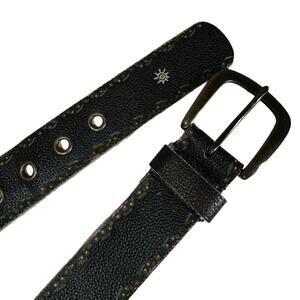 Boho Artisan Black Distressed Painted Floral Belt. Distressed leather belt with black finish and painted floral trim design. No brand or size markings.