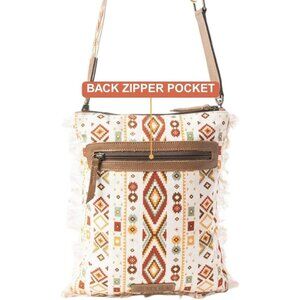 Features: Crafted from upcycled canvas with bold Southwestern Aztec patterns, this artisan-style bag features fringe accents and a matching woven strap for added texture. Compact but spacious with a 9" L x 12" H silhouette, it includes an interior zipper pocket and an exterior zipper compartment for your essentials. The 22" adjustable strap makes it versatile to wear as a crossbody or shoulder bag.