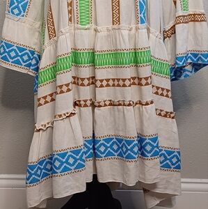 Boho Aztec Print Cotton Blend Bell-Sleeve Embroidered Tunic Dress.
