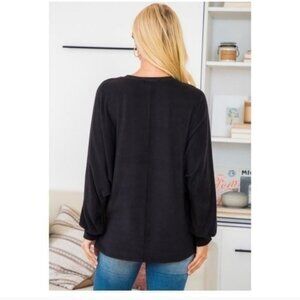 This top combines a bold Aztec print front with a solid black contrast and balloon sleeves, offering a stylish yet comfortable boho vibe.