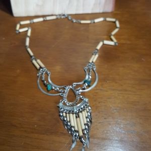 Boho Aztec style necklace with bamboo, turquoise and a Silver alloy. The necklace drapes beautifully and the element in the center falls just below the neckline like a little waterfall. A hook and eye clasp closes the necklace.