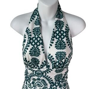 * Excellent pre-owned condition. There are tiny pin holes at the v-neck where it looks like someone pinned it to keep the halter together (see photo 3). No thread pulls. Comes from a smoke-free home. See all photos for measurements and other details.