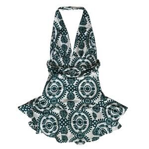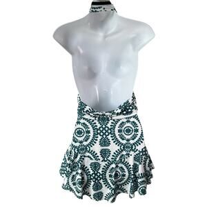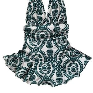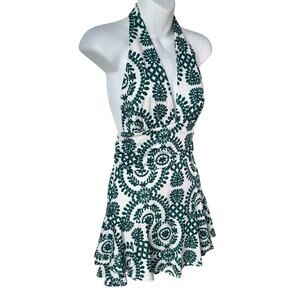 Boho White Green Floral Print Backless Halter Romper Small Ruffle Hem Summer Resortwear Mini
