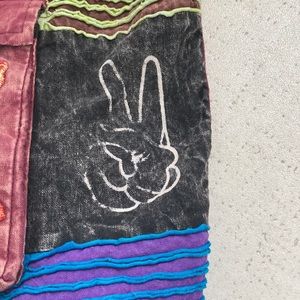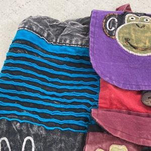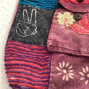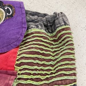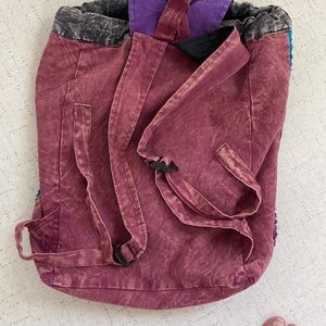 Patchwork pattern, used, one front pocket with button closer, no pockets inside, adjustable straps, color inside is black and multi colors on the outside side of backpack with monkey closer with button. And a draw string black cord to ouch backpack tight. See pictures