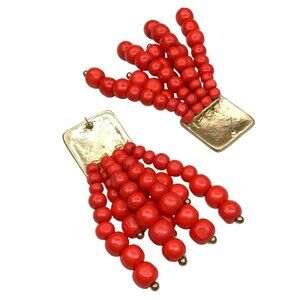 Boho Bamboo Beaded Tassel Earrings Gold Tone Red Orange