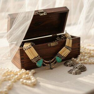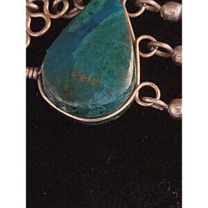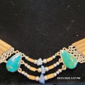 This Boho Bamboo Choker Necklace features 2 polished teardrop, Chrysocolla stones and 3 raw Lapis Lazuli chips, giving it a unique Southwestern style. Bamboo pieces are added for additional boho look.