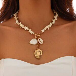 Upgrade your summer look with this statement seashell necklace, featuring delicate white starfish accents and bold golden charm drops. Perfect for beach days, vacay slays, or adding a tropical twist to any outfit.