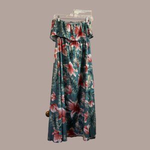 Flowy tropical floral print Boho Beach Hut dress- size small. Excellent condition, only worn once. The dress has two slits in the front and a tie at the waist. Perfect for destination weddings!