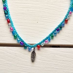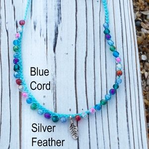 A beautiful handmade Boho style anklet with braided chord and a silver feather charm. Anklet is made with waterproof chord and glass beads. The anklet has a sliding macrame closure and will fit shoe sizes 9 and lower with a maximum ankle circumference of 12 inches.