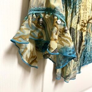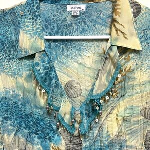 Boho Beaded Floral Top XL Blue Yellow Crinkle Blouse
