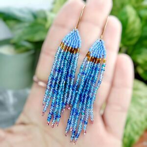 Boho Beaded Fringe Cascade Shoulder Duster Dangle Earrings, Blue & Gold 3.5"