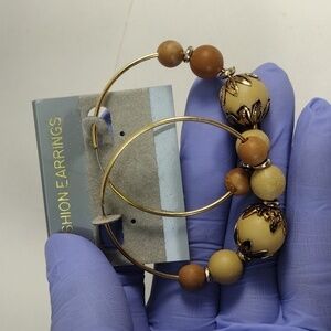 Boho Beaded Hoop Earrings – Natural Wood Look Beads, Gold-Tone Wire – Jewelry #4