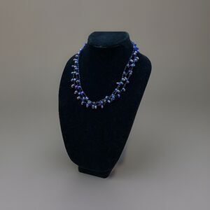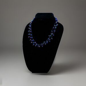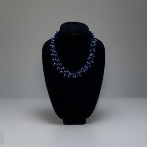 Add shimmer and texture to your look with this layered beaded necklace. Featuring iridescent purple and blue glass beads on black thread, this piece offers a bold yet versatile design. Perfect for a night out, to embracing your inner mystical self, this necklace is a beautiful and elegant piece bound to make a statement!